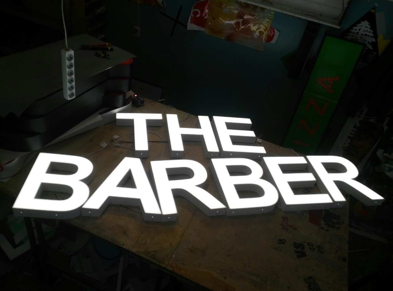 ENSEIGNE LUMINEUSE LED LETTRES BOITIERS 3D “THE BARBER” EXTERNE 40cm DE HAUTEUR