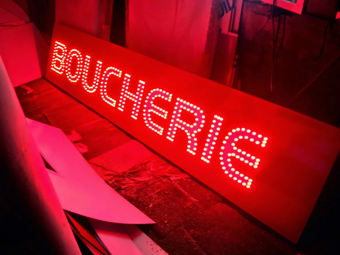 Une signalisation pour boucherie efficace est cruciale pour attirer de nouveaux clients. Avec notre panneau lumineux pour boucherie, vous vous assurez que votre enseigne reste visible et attrayante à tout moment de la journée. Une enseigne claire et accueillante incite les passants à entrer pour découvrir vos produits. Les clients potentiels seront immédiatement attirés par l’éclat et le professionnalisme de votre signalétique.
