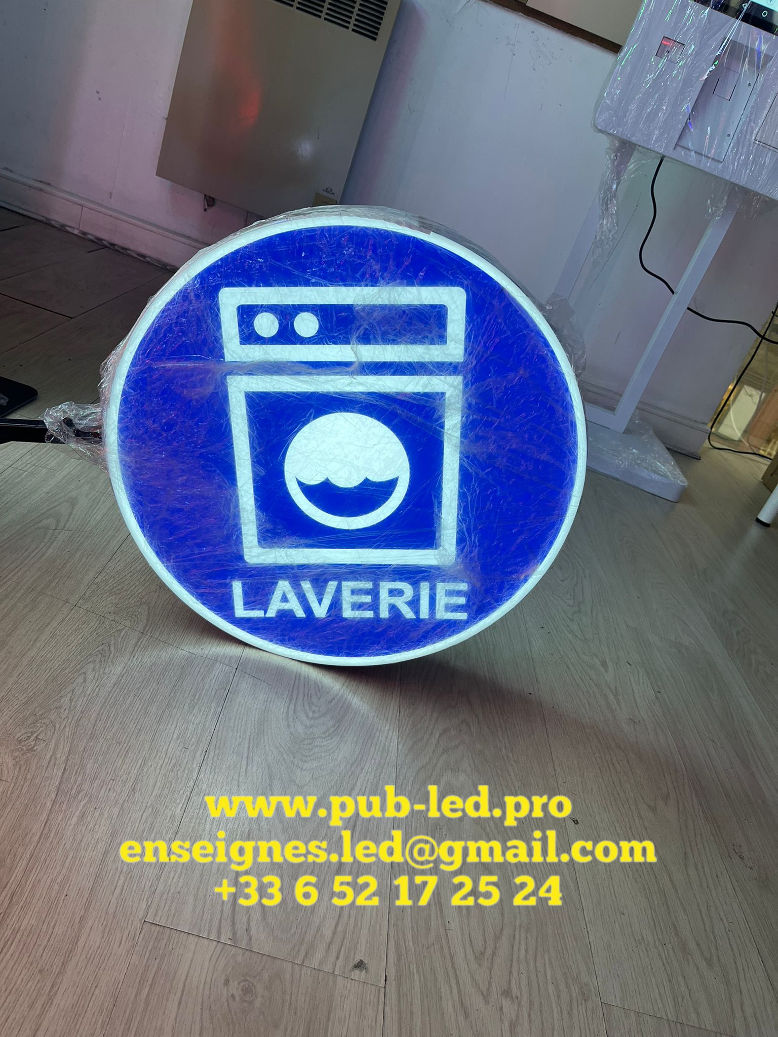 Enseignes Lumineuse Laverie LED double faces avec potence de fixation et Transfo Etanche, pret a installer 50cm de Dia